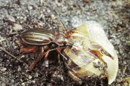 Les carabes constituent une part importante des prédateurs présents dans les parcelles agricoles. Leurs activités prédatrices se révèlent dès les premiers stades larvaires. Les larves sont assez mobiles. Elles peuvent s'attaquer aux gastéropodes ou aux œufs. Chez les carabes, on observe une certaine spécificité des proies. En priorité ils s'attaqueront aux mollusques et aux œufs de ces derniers. La littérature avance aussi d'autres techniques de développement des larves peu répandues, l'ectoparasitisme. On décrit seulement 4 genres pratiquant le parasitisme (tous visent des amphibiens) : Brachinus, Pelecium, Lebia et Lebistina.
