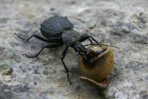 Dans le cas des prédateurs s'attaquant aux gastéropodes, on a observé plusieurs adaptations morphologiques. Des espèces ont subi des adaptations touchant la taille et la force de leurs mandibules, Hadrocarabus lusitanicus, leurs permettant de briser les coquilles des escargots. D'autres espèces, souvent localisées en zones montagneuses, se sont adaptées différemment pour la prédation des escargots : leur tête et leur prothorax se sont affinés et allongés pour pouvoir pénétrer par l'orifice de la coquille et manger la proie à l'intérieur de son système défensif. C'est le cas des espèces du genre Cychrus et d'autres espèces comme Macrothoraxmorbillosus ou Carabus aumonti. Cette adaptation morphologique est dénommée cychrisation. | ![]() |