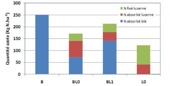 La présence de luzerne n'augmente pas la quantité d'azote dans le système. On peut cependant remarquer qu'une partie de la ressource azote est restituée au système (l'azote fixé), et devient donc disponible pour le blé.