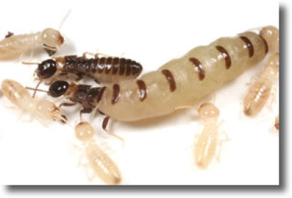 Chez les termites, la capacité de se reproduire est contrôlée par une hormone diffusée par le couple royal. L'introduction dans la colonie d'individus sexués est définie par le roi et la reine qui bloquent les individus de la colonie à un stade pré-sexuel. L'hormone inhibitrice est transmise par le léchage des ouvriers et par la trophallaxie[1]. En fonction des conditions météorologiques et de la période de l'année, le couple royal va donc choisir de déclencher l'essaimage. ( BARBIER G., 2009[2]).