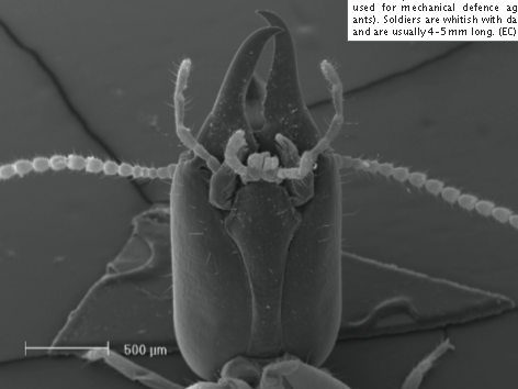 Les soldats sont morphologiquement adaptés aux combats : ils possèdent des mandibules disproportionnées, si bien qu'ils sont incapables de se nourrir tout seuls. Ils sont aussi les rares membres de la colonie à pouvoir sécréter des substances chimiques de défense contre les prédateurs.