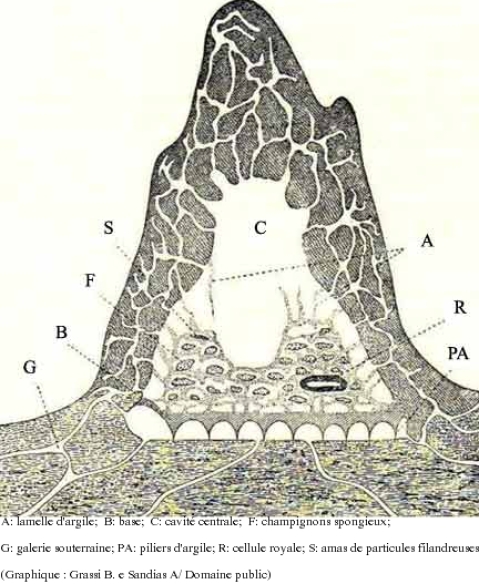 Le nid est bâti sur des piliers d'argiles confectionnés à l'aide de la salive des termites ouvrières. Au-dessus de ces piliers reposent beaucoup de petites cavités, dont la chambre royale et les chambres de culture des basidiomycètes. Ces cavités sont séparées par de fines lamelles d'argiles. Encore au-dessus repose la cavité centrale et tout autour sont construites des parois de boue très épaisses et solides.