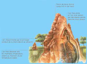 Comme on le voit sur le schéma ci-contre, la termitière est construite de manière à maintenir un microclimat favorable aux différents groupes de termites mais aussi aux champignons dont ils se nourrissent. Les nids subissent un remaniement constant de leur architecture et de leur taille ce qui permet d'adapter le nid à la population de termites présentes ( Duboisset A. 2003[1]). Une termitière a une durée de vie d'environ 10 ans. |