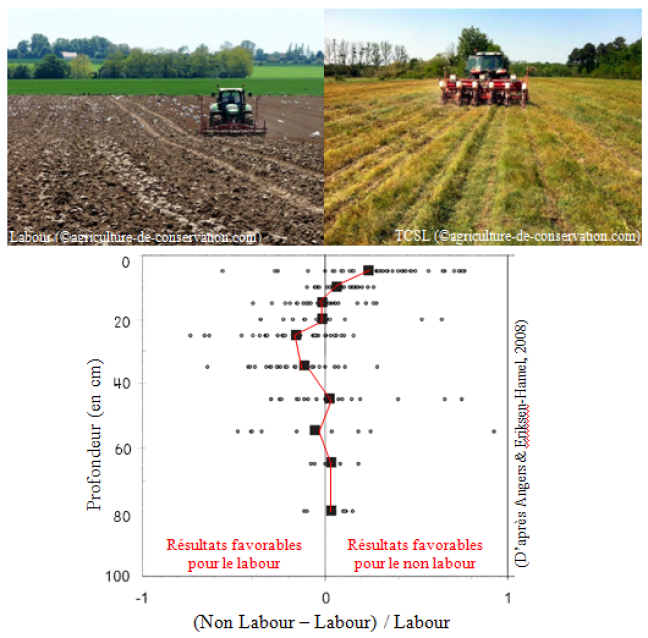 Sur les quelques études où les échantillonnages ont été étendus au delà de 30 cm de profondeur, les TCSL ne mettent pas en évidence une accumulation supérieure et cohérente de carbone organique dans les sols. Seule une différence dans la distribution du carbone a été observée, avec une plus grande concentration près de la surface en AC et dans les horizons plus profonds en labour conventionnel .