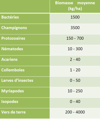 L'ensemble de ces organismes vivants dans le sol représente la biomasse vivante du sol qui peut atteindre selon les écosystèmes plusieurs tonnes par hectare (pour 30 cm de profondeur). Le tableau montre que la biomasse de bactéries et de champignons peut dépasser le poids de vers de terre maximum rencontrés dans une parcelle. |