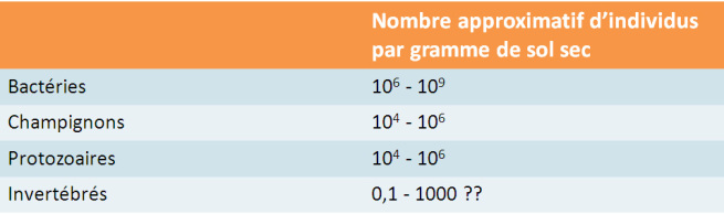 Chacune de ces espèces n'est pas représentée que par un seul individu mais par une multitude d'individus. Dans notre gramme de sol, on peut ainsi compter jusqu'à 1 milliard de bactéries et 1 million de champignons et de protozoaires. |