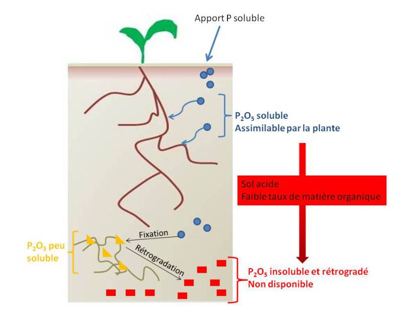 La rétrogradation est liée au pH et à la teneur en calcium. Lors d'un apport, le phosphore peut passer d'un état soluble à solide, indisponible pour la plante. Ce phénomène de rétrogradation dépend de divers facteurs : il est plus important dans les sols calcaires ou acides. Dans un sol acide, on pourra pratiquer le chaulage afin de maintenir un pH neutre. Le phénomène s'intensifie avec une température élevée et une faible teneur en matière organique[1]. |