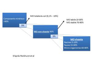 Les matières organiques des sols forment un ensemble hétérogène constitué de litières, de résidus[1] de culture, de racines vivantes, d'animaux de tailles diverses ... Mais aussi de débris végétaux en cours de décomposition et de matières évoluées non identifiables à l'oeil : l'humus. La fraction organique du sol représente un faible pourcentage, seulement 1 à quelques % dans les sols cultivés. | Exemple de composition des matières organiques (en poids) d'un sol fertile (©Pankhurst et al.) | [2] |