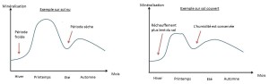 Supprimer le labour[1] a un impact sur la quantité et la répartition des matières organiques dans le sol. En effet, au lieu d'être diluée, elles sont concentrées en surface. En plus, l'oxygène n'est plus apporté par le retournement du sol. En conséquence la minéralisation[2] est beaucoup plus faible, en particulier les premières années. Les deux pics annuels de minéralisation observés en agriculture conventionnelle sont fortement atténués. |