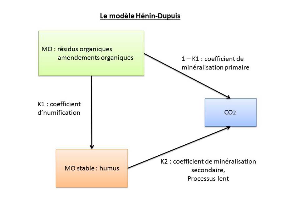 La matière organique morte est répartie en deux compartiments : la MO[1] libre et la MO stable (humus). Des flux s'établissent entre ces deux compartiments et la fraction minérale du sol. Motorisée par les micro-organismes[2], ils impliquent des réactions de minéralisation[3] et d'humification[4]. |