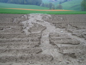 Une forte pluie tombant sur un sol nu entraîne la formation d'une semelle de battance, c'est-à-dire une couche de terre solide en surface du sol qui bloque l'infiltration de la pluie, les échanges gazeux et la germination des graines. En effet, les gouttes d'eau de pluie qui tombent ont une forte énergie cinétique liée à leur mouvement. Ainsi, lorsqu'elles arrivent sur de petits agrégats de terre, ceux-ci éclatent et se répandent aux alentours. Il se forme alors cette couche homogène. Imaginons la même situation avec un sol couvert. Celui-ci est composé de feuilles ou de résidus[5] qui freinent les gouttes d'eau et diminuent donc fortement leur énergie. Ainsi, les mottes de terre sur lesquelles elles tombent ne sont plus déstructurées. L'eau pourra donc facilement s'infiltrer. |