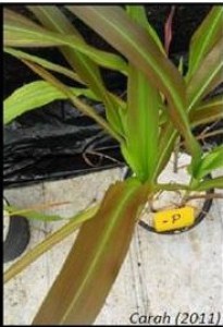 Bien que le phosphore soit présent dans les roches du sous-sol, il est très peu disponible pour les plantes, du fait de sa faible mobilité et du phénomène de rétrogradation. Une carence[1] en phosphore est décelable suite à une croissance réduite, ainsi qu'une coloration violette des feuilles. | Plante de maïs carencée en phosphore (©Carah) | [2] |