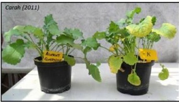 Plants de colza (Brassica napus) témoins et carencés en potassium (à droite) (©Carah) | [3] | Le potassium est de façon générale suffisamment présent et disponible dans les sols cultivés. Cependant des carences peuvent s'installer, en particulier dans les sols sableux, ou en cas d'irrigation excessive. On observera alors la périphérie des feuilles brunir et s'enrouler sur elles-mêmes. |