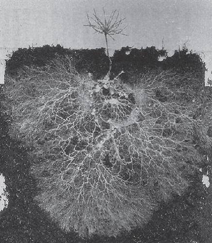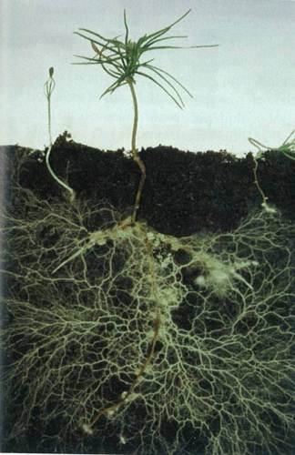 Le système associé de la mycorhizosphère est donc plus grand et bénéficie du réseau fortement ramifié des hyphes fongiques pour couvrir un volume de sol plus élevé (le système ramifié de la mycorhize peut atteindre jusqu'à 30m d'hyphes fongiques par gramme de sol).