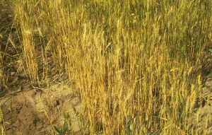 C'est une maladie cryptogamique qui touche les céréales à pailles, notamment le blé. Elle est causée lors de l'infection de la plante par les champignons Gaeumannomyces gramini et Ophiobolus graminis. Les dégâts sont facilement observables lors des stades épiaison et floraison des cultures de graminées, mais le champignon peut se développer sur les tiges et racines dès la levée (entraînant un tallage plus faible lors d'infection précoce). On observe alors généralement des zones circulaires caractéristiques présentant une maturité précoce, des épis blancs desséchés et vides, des pourritures sombres sur la base de la tige et sur les racines (nécroses). Les plants atteints sont facilement arrachées du sol et on y observe des nécroses et atrophies des racines. Le champignon se transmet par les restes de chaumes, les repousses et adventices graminées, et est donc caractéristique d'une culture sur précèdent de céréale, ou bien d'une contamination croisée (apport de paille, résidus sur les machines etc...) | Symptomes du piétin échaudage sur culture de blé - photo : William M. Brown Jr. from Wikimedia Commons | [2] |