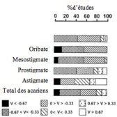 Pour les acariens, les réponses sont plus variées et plus extrêmes suivant les groupes auxquels ils appartiennent. En effet, ces différents groupes taxonomiques semblent répondre différemment aux effets du labour conventionnel. Les oribates et les mésostigmates semblent être modérément à extrêmement inhibés par le labour conventionnel comparé au non-labour. Les astigmates sont soit inhibés soit stimulés par le labour (avec une légère valorisation en labour). Ils semblent se remettre beaucoup plus rapidement des effets d'un labour. Cela est dû à une stratégie de reproduction rapide, ils peuvent alors coloniser intensément toutes les niches devenues disponibles. | ![]() Index V selon les différents familles d'acariens |