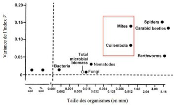 Le labour semble affecter les populations d'organismes du sol par une perturbation physique du sol (mortalité lors du labour, emprisonnement des organismes dans des mottes de terres). La diminution des populations peut également s'expliquer par un enfouissement des résidus de cultures (perte en surface), à un changement de l'eau ainsi qu'à un changement de température du sol dû fait de l'incorporation des résidus dans le sol ( Kladivko, 2001[3]). Wardle souligne le fait que l'effet du labour sur les organismes du sol ne doit pas simplifié par un simple indice (indice V). En effet, pour lui, il est nécessaire de prendre en compte toutes les interactions trophiques de ces organismes (habitats, alimentation, stratégie de reproduction, effet bottum-up, bottum-down, etc.) ( Kladivko, 2001[3]). Le graphique représentant la variance de l'index V (ci-contre), indique qu'il existe une grande variabilité entre les espèces de la mésofaune. Suivant les familles ces organismes peuvent réagir différemment. |