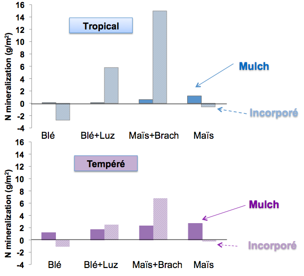 Au contraire, quand les résidus sont incorporés, on observe une immobilisation nette ou une minéralisation nette. Le blé et le maïs seuls, montrent une immobilisation nette de l'azote quand les pailles sont incorporées au sol quelque soit le climat. Lorsque ces résidus sont en association (blé+luzerne ou Mais+brach) on observe alors une minéralisation nette de l'azote avec une minéralisation plus importante pour le climat tropical dans les deux cas.
