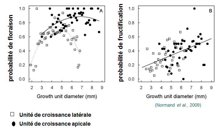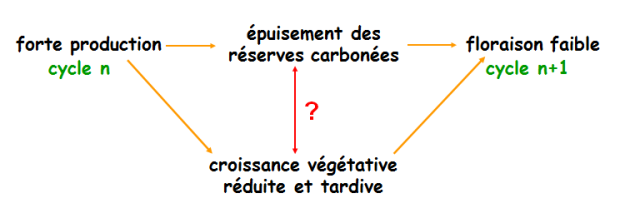 Le rythme de croissance mère-fille et le délai entre la date d'apparition unité de croissance et la date de floraison (environ 7 mois) entretiennent les asynchronismes. Les asynchronismes de la croissance se répercutent au niveau de la floraison.