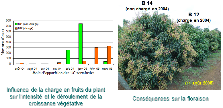 Pour les asynchronismes entre les arbres, la charge en fruits est un facteur important. Par exemple, un arbre qui est chargé en fruit va avoir en tendance à débuter sa croissance végétative tardivement. Cette dernière sera faible à la différence d'un arbre peu chargé en fruits.