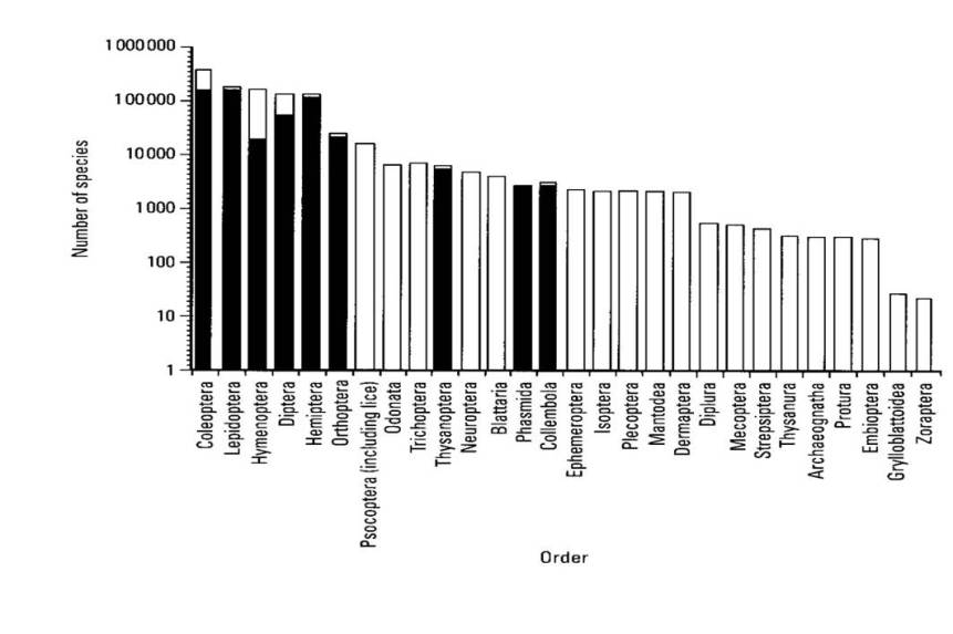 La partie noire des barres de l’histogramme représente la proportion de phytophages dans chaque ordre d'insectes.