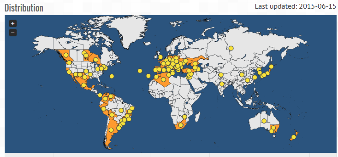 Distribution mondiale visualisée ci-dessous sur la carte obtenue à partir de l'EPPO Global Database, code VITEVI.