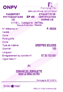 Photographie d'une étiquette de certification-passeport phytosanitaire de matériel initial. |