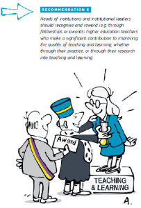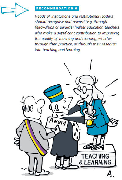 Open doors by clarifying misinterpretation of the implication of the teaching staff The people in charge must recognise and reward the professors and teaching staff who bring about significant improvements to the quality of teaching and learning in higher education thanks to their teaching and/or research Source : UE report 'Improving the quality of teaching and learning in Europe's higher education institutions' JUNE 2013. Recommendation 6. |